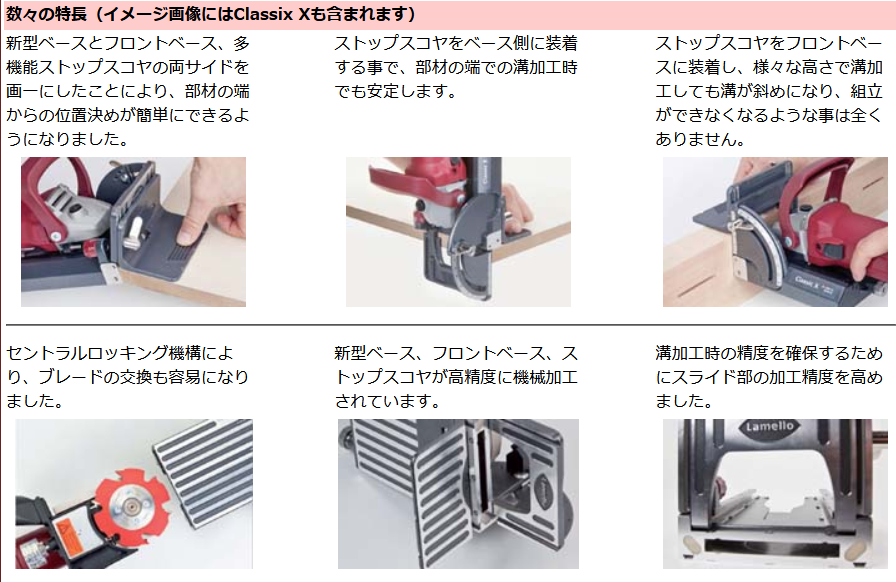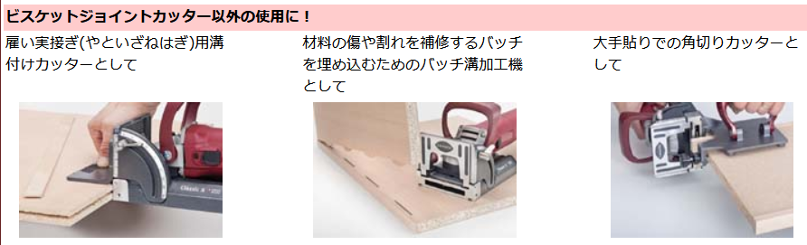 | 標準付属品 | ・超硬カッターブレード ・多機能ストップスコヤ ・シックネスプレート ・集塵口23mm ・集塵アダプター36mm径 ・ダストバッグ・工具一式 ・キャリングケース |